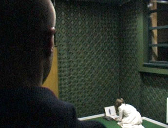 The unusual thing about Maeterlinck’s drama is the metaphorical representation of a principle that brings change and death, but remains invisible and only becomes tangible through the effects that it has on its surroundings– similar to the mysterious “something” in David Lynch’s Lost Highway, which enters an apartment and records its sleeping inhabitants on video. In the staged installation Der Eindringling this principle is not narrated via the usual spectator-actor relationship. Instead the viewer is given the perspective of the intruder, experiencing the first part of the story from the viewpoint of death as it approaches. The camera (visual perspective) moves through the garden, the cellar door and up the staircase into the bedroom. The viewers hear the conversation of the old man with the other family members who sense death approaching.